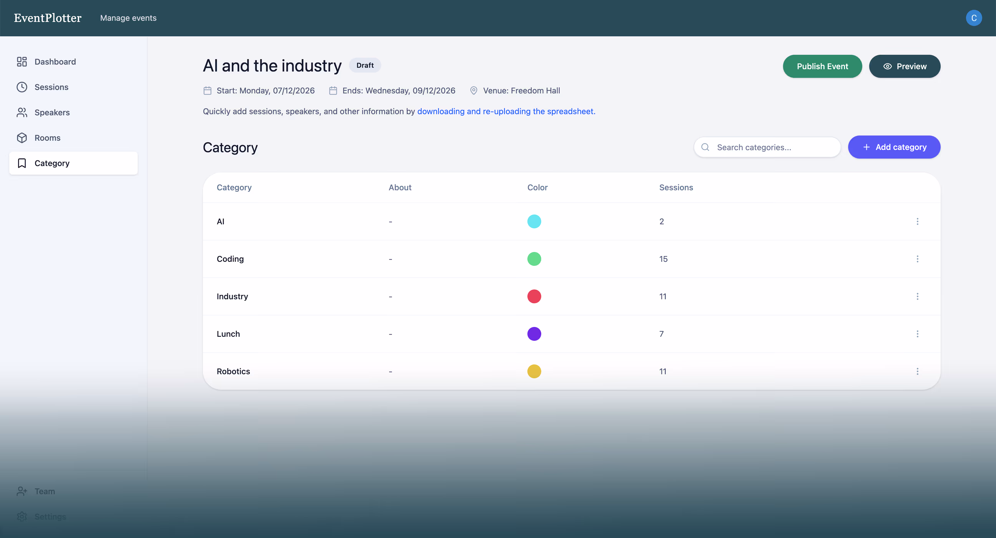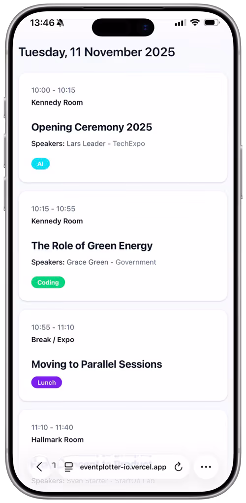 Absolutely. We believe you should see the result before you pay. You get full access to every single module—including Speakers, Sessions, and color-coded Categories—from day one at zero cost. There are no "pro" tiers hiding features; everything is unlocked so you can build your program with zero risk.